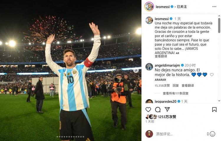 梅西写道:“一个令我激动到至今仍无法言表的特殊夜晚,衷心感谢所有人的厚爱与始终如一的支持。无论发生什么,无论未来如何,唯有上帝知晓……阿根廷加油!”